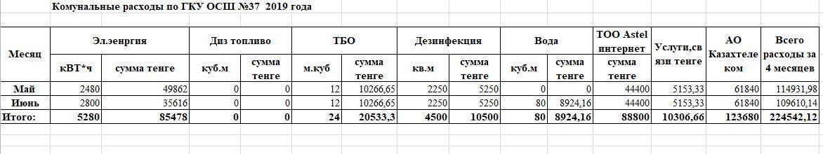 Комунальные расходы по ГКУ ОСШ №37 2019 года » "Ілияс Жансүгіров атындағы №37 жалпы білім беретін орта мектебі"